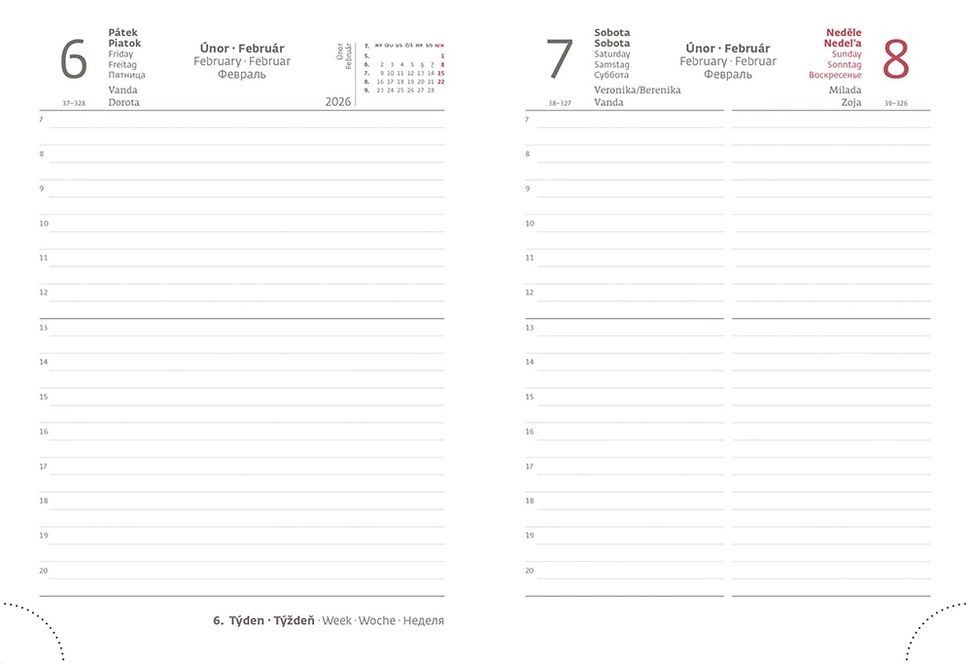 - Diář obsahuje: osobní údaje, plánovač dovolené (měsíční přehled), plánovací kalendář, telefonní předvolby, státní svátky České a Slovenské republiky, mezinárodní svátky, roční výhled, denní layout, adresář, mapa Evropy a České a Slovenské republiky.
