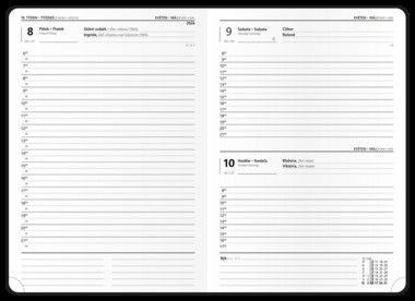 Denní diář A5 má krásnou populární barvu a efektní zlatou ražbu roku. Každý den na jedné straně Vám dá prostor mnoha poznámek a časového plánování.