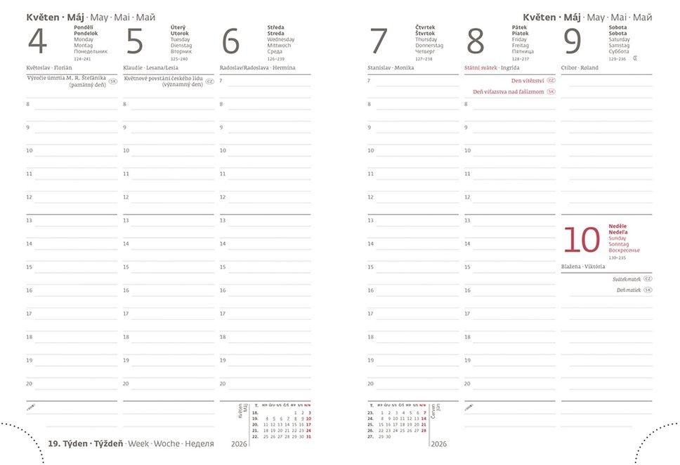 - Diář obsahuje: osobní údaje, plánovač dovolené (měsíční přehled), plánovací kalendář, telefonní předvolby, státní svátky České a Slovenské republiky, mezinárodní svátky, roční výhled, týdenní layout, adresář, mapa Evropy a České a Slovenské republiky.