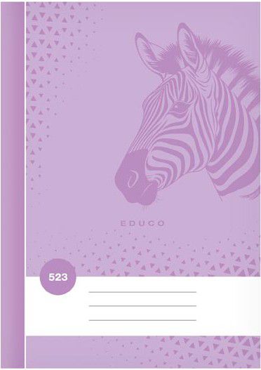 Školní linkovaný sešit ve formátu A5, ve fialové barvě, s motivem zebry, v deskách z křídového papíru. Stránky jsou bez okrajů.