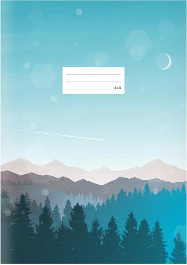 Školní linkovaný sešit ve formátu A4, laděný do modra s motivem krajiny, v originálních deskách s matným laminem a lokálním UV lakem. Stránky jsou opatřené okraji o šířce 1,5 cm.