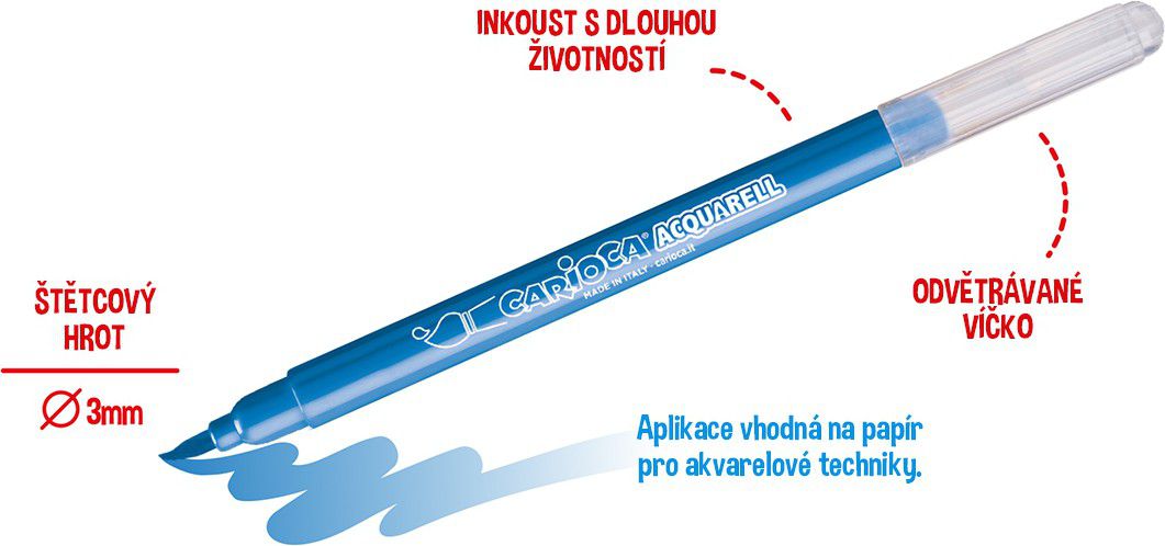 - Speciální fixy s jemným štětcovým hrotem pro precizní tahy. Ideální pro akvarelové techniky, ve vodě rozpustné.