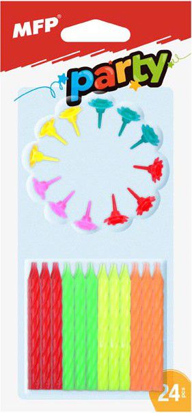 - BALENÍ OBSAHUJE: - 24 ks neon barevných svíček (zelená, červená, žlutá, růžová) - 12 ks barevných držáků