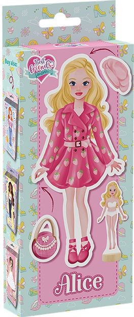 - Balení obsahuje oblékací postavičku, 3 archy magnetických částí oblečení, bot a doplňků a dřevěný podstavec.