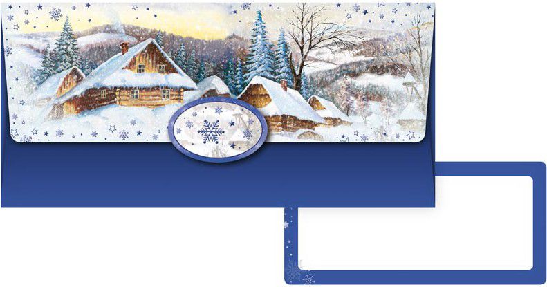 Dárková obálka na peníze s vánočním motivem zasněžené vesnice a uzavíratelnou klopou.