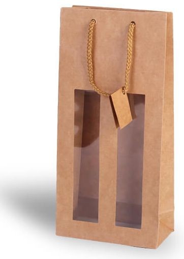 Papírová luxusní taška v přírodní hnědé barvě na dvě lahve s fóliovaným okénkem z hladkého kraftového papíru