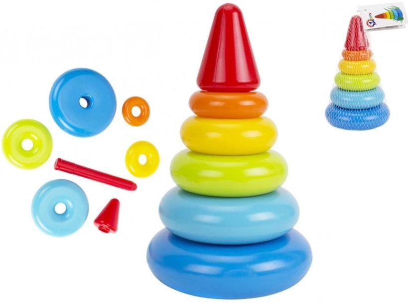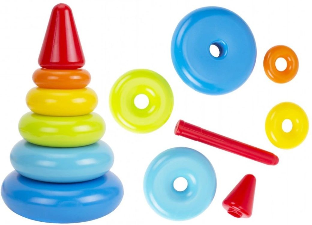 Skládačka pyramida s kroužky, díky které se děti učí rozeznávat barvy a velikosti.