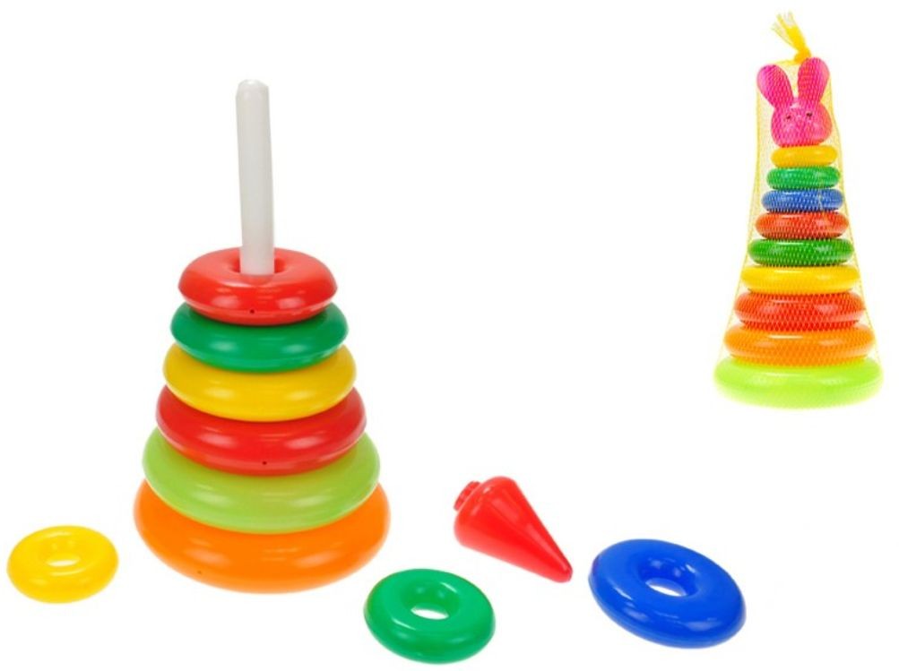 Skládačka pyramida s kroužky, díky které se děti učí rozeznávat barvy a velikosti.