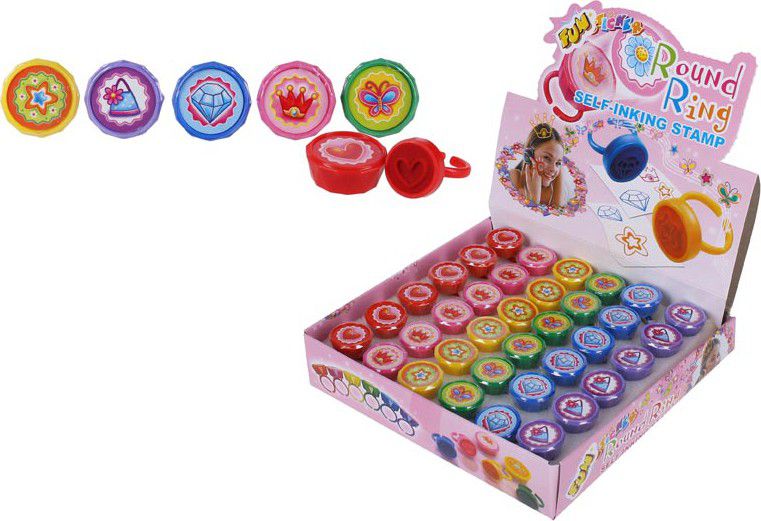 Dětské, samonamáčecí, kulaté razítko z plastu ve tvaru prstýnku. Nakresli si obrázek a vyzdob ho razítky! Samotisknoucí razítka jsou ideální pro všechny kreativní děti, které si rády malují! Na předním obalu je vždy vyobrazen určitý obrázek. Razítka jsou v různých barvách. Určeno pro děti od 3 do 6 let. Varování: Slouží jako výtvarná pomůcka na potisk papíru. Používat pod dozorem dospělé osoby. Obal odstraňte z dosahu dětí. Všech 36 ks je uložených v krabičce. Dodáváme v mixu 6 ks dle skladové zásoby. Uvedená cena je za 1 ks.