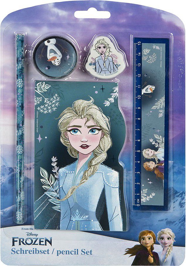 - Sada školních pomůcek s motivem Frozen obsahuje tužku, tvarovanou gumu, krabičku na ořezávátko, pravítko a tvarovaný poznámkový blok.