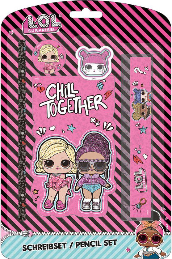 - Sada školních pomůcek s motivem LOL Surprise obsahuje tužku, tvarovanou gumu, krabičku na ořezávátko, pravítko a tvarovaný poznámkový blok.
