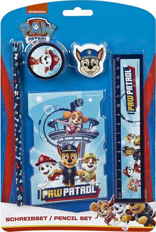 - Sada školních pomůcek s motivem Tlapkové patroly obsahuje tužku, tvarovanou gumu, krabičku na ořezávátko, pravítko a tvarovaný poznámkový blok.