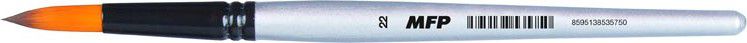 - Štětec kulatý s jemným syntetickým vlasem tvarovaným do špičky a dřevěnou rukojetí.