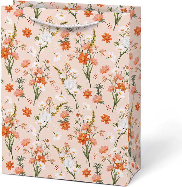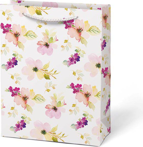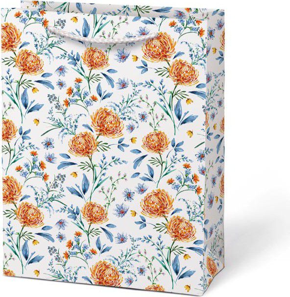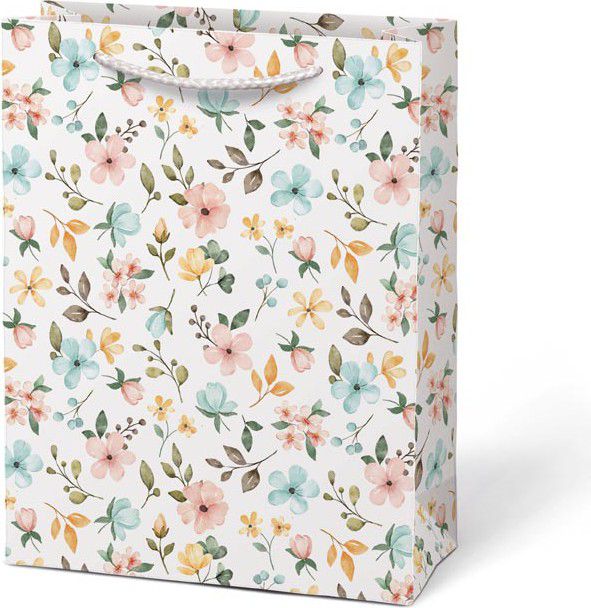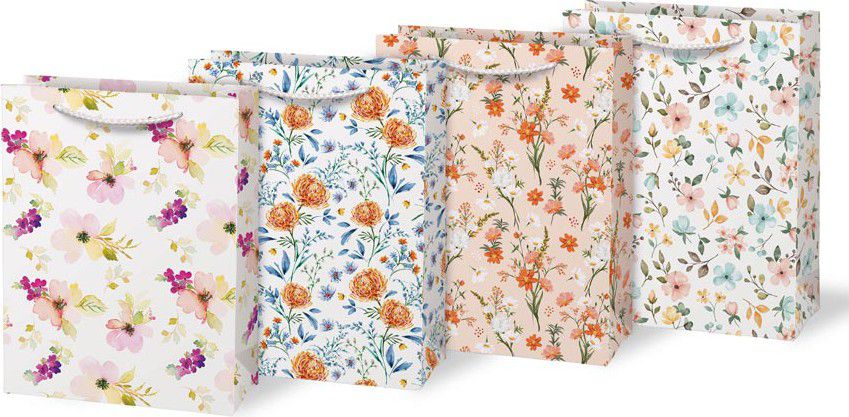 - Dárková papírová taška T4 zdobená různými květinovými motivy.