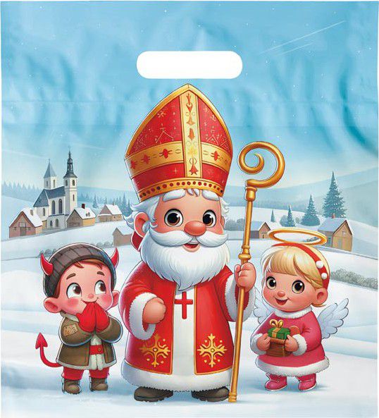 Igelitová taška s průhmatem a barevným mikulášským motivem. Je ideální pro různé typy dárků, od malých sladkostí a hraček až po větší předměty. Na tašce je obrázek Mikuláše, anděla a čerta. Taška je vybavena průhmatem, což je otvor v horní části tašky, který slouží jako rukojeť. Tento průhmat umožňuje snadné a pohodlné přenášení tašky. Díky pevnému plastovému materiálu je taška odolná proti roztržení a vlhkosti, čímž zajišťuje, že dárky uvnitř zůstanou v bezpečí a suchu.