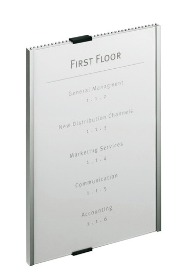 Nástěnná informační tabulka v jednoduchém účelném designu z hliníku a průzračného akrylu.
