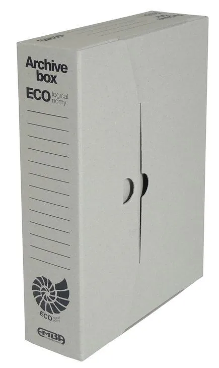 Archivační krabice EMBA Economy pro formát A4. Vyrobena z recyklované lepenky, rozměry 325 × 240 × 75 mm. Možnost popisu a ukládání ve třech polohách, ekologicky šetrná. Celý popis