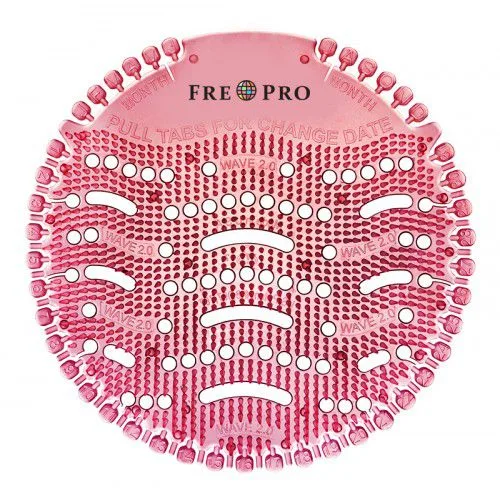 Aromatické a gelové vonné sítko FrePro Wave2 do pisoáru s indikátorem data výměny.Velice příjemná a decentní vůně, Kiwi,která je 15x intenzivnější než mají běžná vinylová sítka. Eliminuje pachy a optimizuje tvorbu bakterií, zabraňuje šíření pachů hned v jejich zárodku. Výrobce garantuje plnou účinnost po dobu 30 dnů. Speciálně vyvinutý design zajišťuje rychlejší a účinnější splachování obsahu pisoáru, mísa se průběžně čistí. Úspora času pro úklid až 50%. Transparentní design umožňuje průběžnou kontrolu stavu odpadních cest, účinněji brání ucpávání. V procesu působení sítko uvolňuje účinné bakterie– pohlcovače pachů a vonné látky, proto se mírně smršťuje. Kulatý tvar umožňuje umístění do každého typu pisoáru. Neobsahuje žádné látky poškozující ozon, ani žádné látky ohrožující lidské zdraví. Delší bodlinky účinněji zabraňují rozstřikávání moči, usnadňují očistu pisoáru a uvolňují více vůně do prostoru. Sítko se vkládá do pisoáru bodlinkami nahoru.