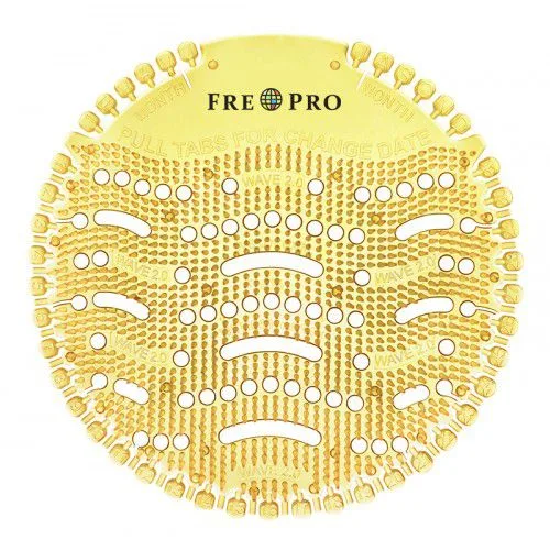 Aromatické a gelové vonné sítko FrePro Wave2 do pisoáru s indikátorem data výměny.Velice příjemná a decentní vůně,Citrusu, která je 15x intenzivnější než mají běžná vinylová sítka. Eliminuje pachy a optimizuje tvorbu bakterií, zabraňuje šíření pachů hned v jejich zárodku. Výrobce garantuje plnou účinnost po dobu 30 dnů. Speciálně vyvinutý design zajišťuje rychlejší a účinnější splachování obsahu pisoáru, mísa se průběžně čistí. Úspora času pro úklid až 50%. Transparentní design umožňuje průběžnou kontrolu stavu odpadních cest, účinněji brání ucpávání. V procesu působení sítko uvolňuje účinné bakterie– pohlcovače pachů a vonné látky, proto se mírně smršťuje. Kulatý tvar umožňuje umístění do každého typu pisoáru. Neobsahuje žádné látky poškozující ozon, ani žádné látky ohrožující lidské zdraví. Delší bodlinky účinněji zabraňují rozstřikávání moči, usnadňují očistu pisoáru a uvolňují více vůně do prostoru. Sítko se vkládá do pisoáru bodlinkami nahoru.Cena za 1ks