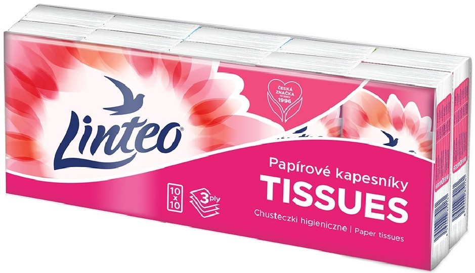 Každé balení obsahuje 10 balíčků a v každém z nich najdeme 10 bílých 3vrstvých kapesníků.