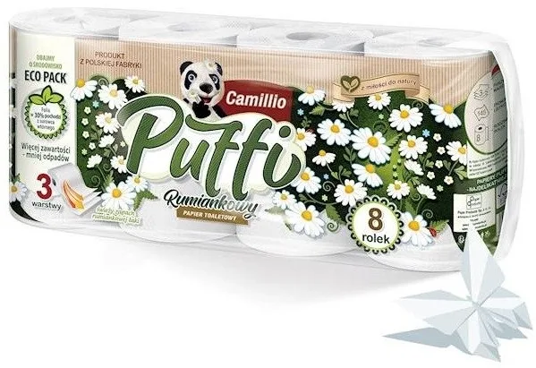 Toaletní papír Puffi, 3vrstvý, s heřmánkovým extraktem. Balení obsahuje 8 kusů. Vhodný pro citlivou pokožku. Celý popis
