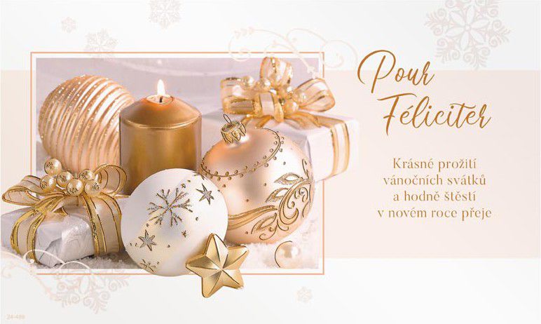 - Text na přední straně přání: Pour Féliciter, Příjemné prožití vánočních svátků a hodně šestí v novém roce přeje