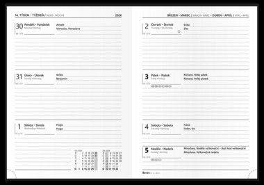- Týdenní diář formátu B6 je vyrobený z matného hladkého lamina s parciálním lakem, který dodává každému diáři šmrnc.
