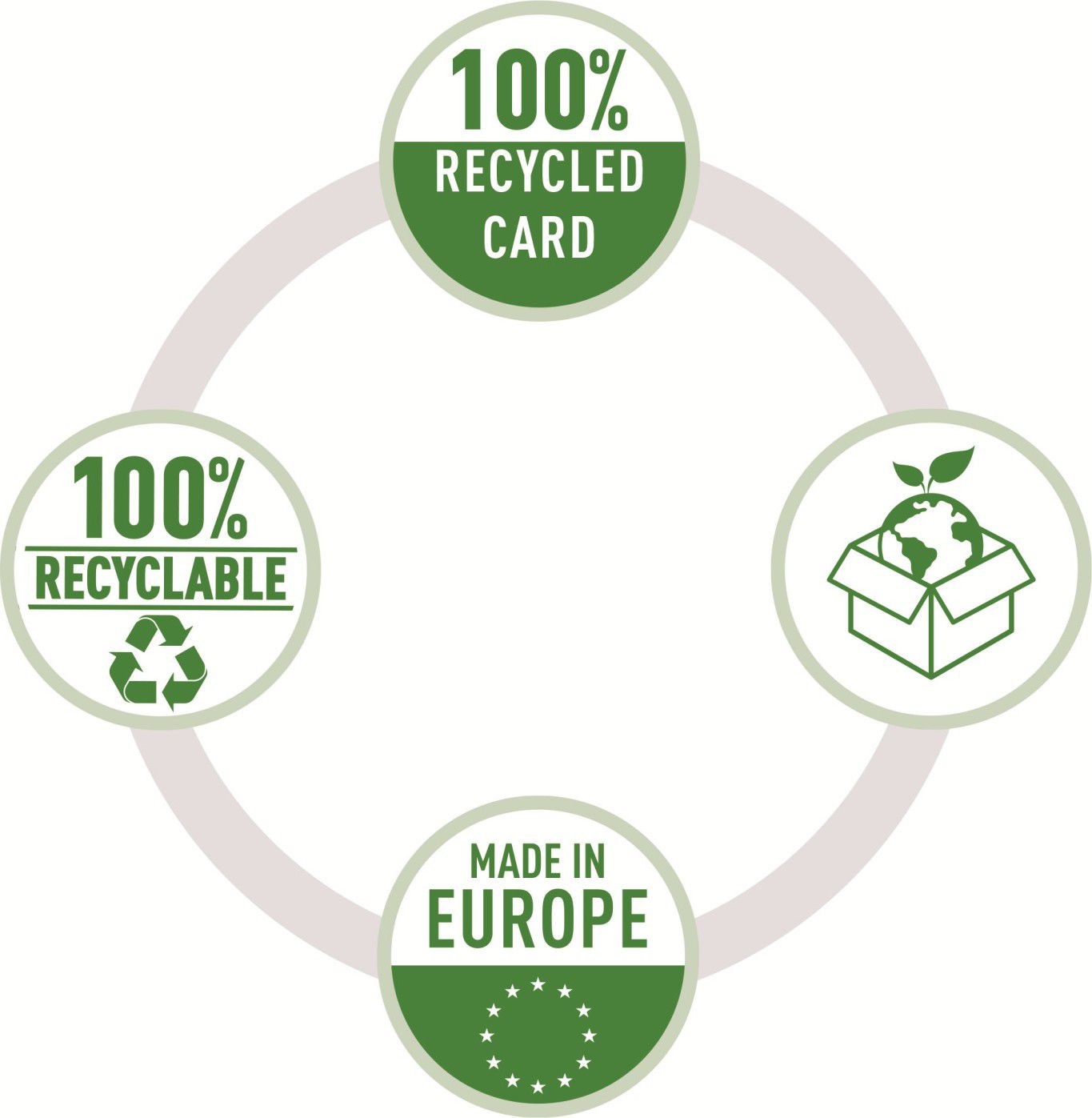 - vyrobeno z pevné a odolné 100% recyklované a 100% recyklovatelné vlnité lepenky s certifikací FSC