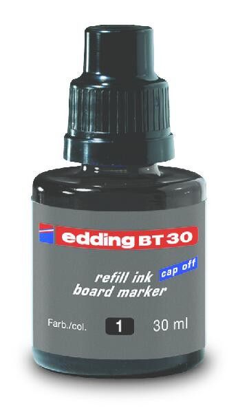 Náhradní inkoust BT 30 pro plnění tabulových popisovačů Edding 250, 361, 365, pro psaní a značkování na bílých tabulích. Smazatelný za sucha téměř ze všech hladkých nepórovitých povrchů jako např. email, sklo, melamin. Stálý na světle a rychle zasychající. Bez přídavku butylacetátu. Obsah 30 ml v lahvičce s kapátkem.