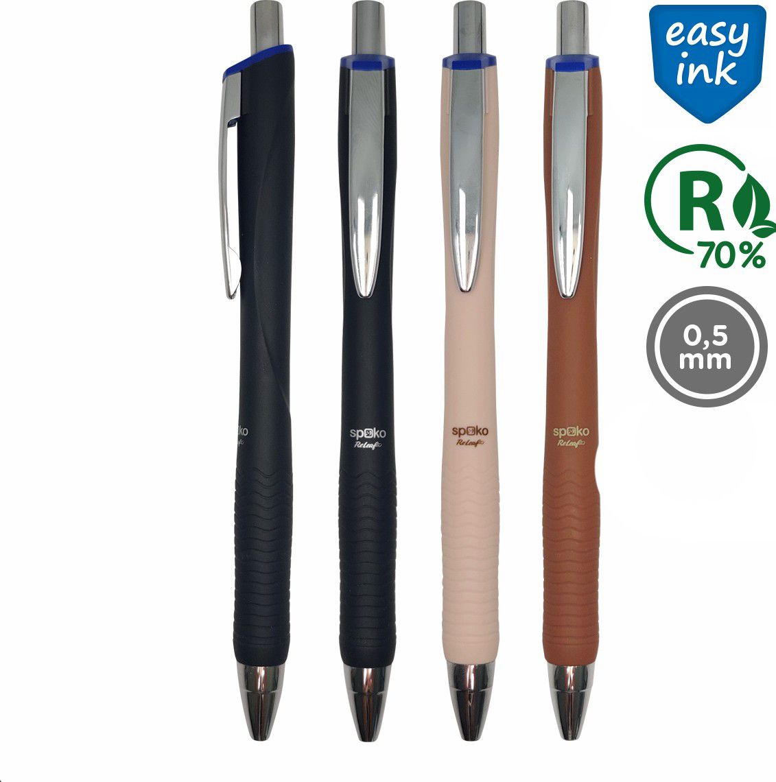 Kuličkové pero se stiskací mechanikou a matnou povrchovou úpravou. Kovový klip a tvarovaný pogumovaný úchop s drážkami. Jedinečná náplň Easy Ink – inkoust s nízkou viskozitou pro pohodlnější a plynulejší psaní. Vyrobeno ze 70 % recyklovaného plastu.