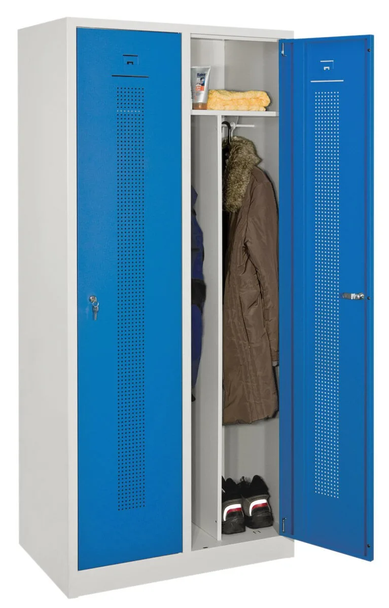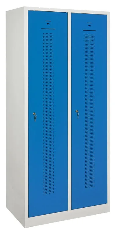 - Svařovaný 2-dveřový šatník na soklu s perforovanými dveřmi.