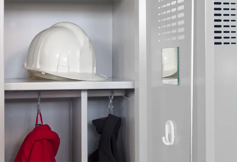 - Výbava oddílu - svislá mezistěna oddělující prostor pro pracovní a civilní oděv (rozdělí oddíl na 150 a 250 mm), polička, tyč na ramínka se 2 háčky, větrací otvory ve dveřích, jmenovka na dveřích, zrcátko, samolepící háček pro ručník.