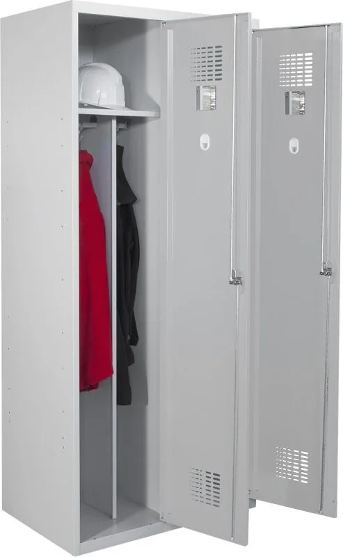 Šatní skříň s mezistěnou a cylindrickým zámkem. Rozměry: 180x80x50 cm. Barva: šedá. Dva dveře. Určeno pro profesionální použití. Celý popis