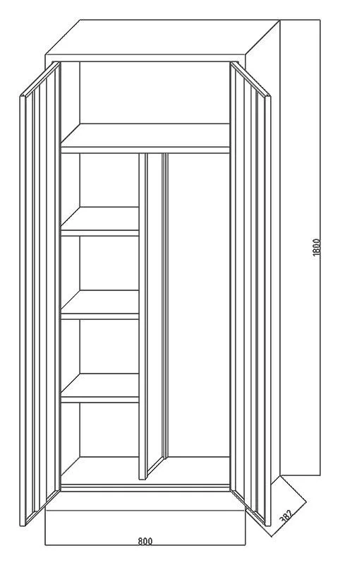 - Svařovaná skříň z ocelového plechu, vnější rozměry skříně v x š x h = 1800 x 800 x 380 mm.