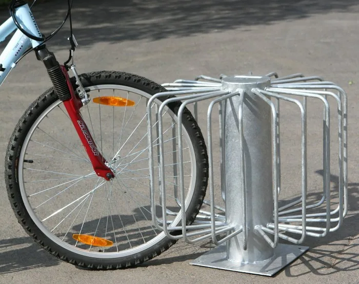 Stojan na kola je vhodný pro všechny typy kol, kapacita až 10 kol. Vyroben z ocelových profilů, povrchová úprava žárovým zinkem. Hmotnost 20 kg, rozměry 600 x 640 mm, možnost uchycení k zemi. Celý popis
