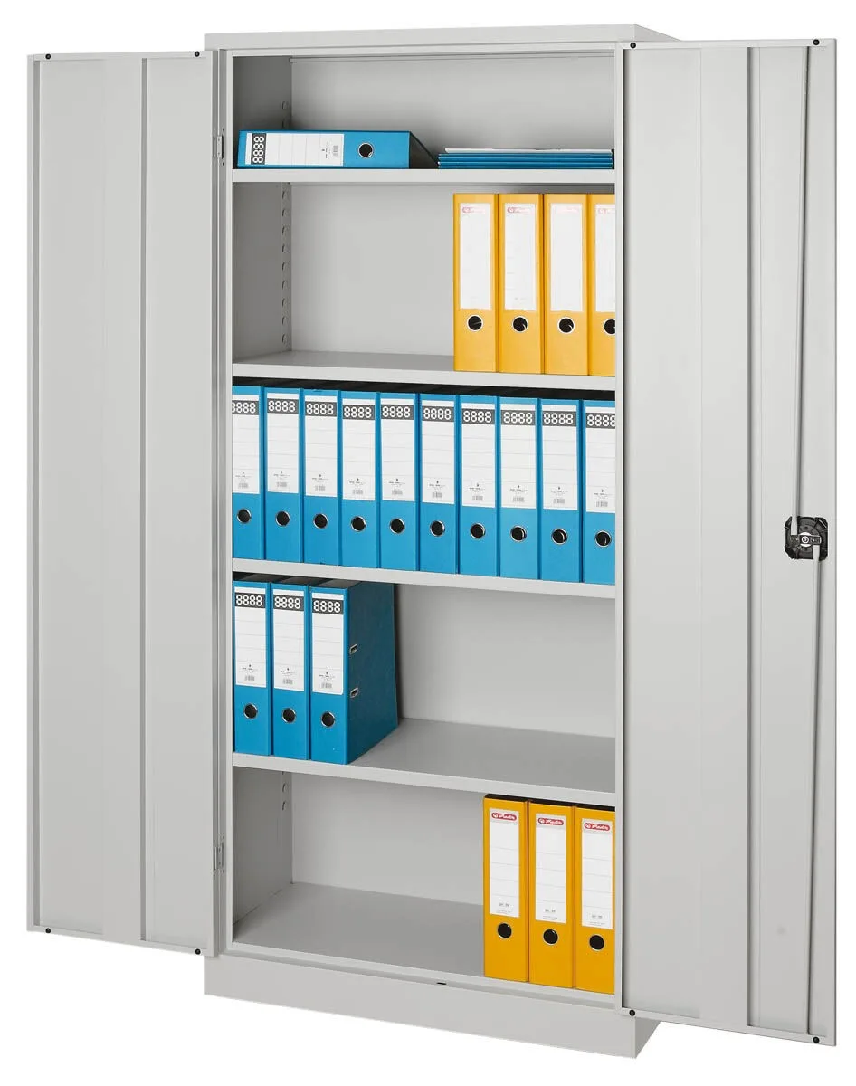 Kovová skříň svařovaná z ocelového plechu s rozměry 1800 x 800 x 380 mm. Dvoudveřová s vyztuženými křídly, cylindrický zámek Burg, 4 police s nosností 50 kg a výškovou přestavitelností. Povrchová úprava práškovou barvou, šedá RAL 7035. Celý popis