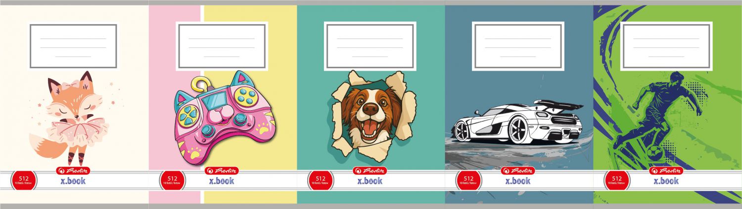 - Sešit nabízí mix motivů – gamepad, pes, auto, fotbalista a liška – které dodávají každému zápisku hravý a veselý vzhled.