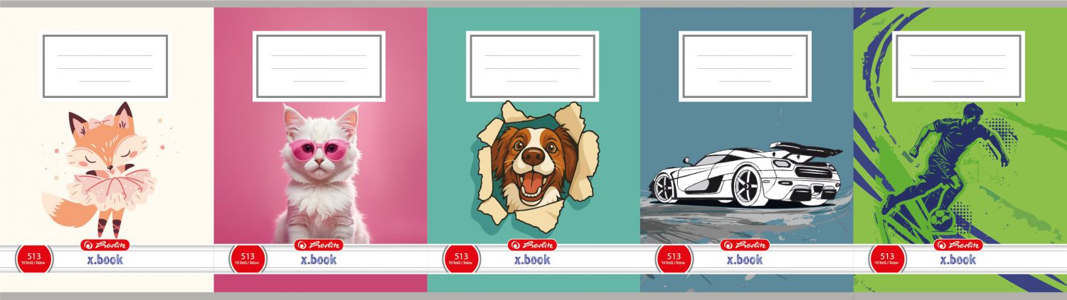 - Sešit nabízí mix motivů – liška, kočka, pes, auto a fotbalista – které dodávají každému zápisku hravý a veselý vzhled.