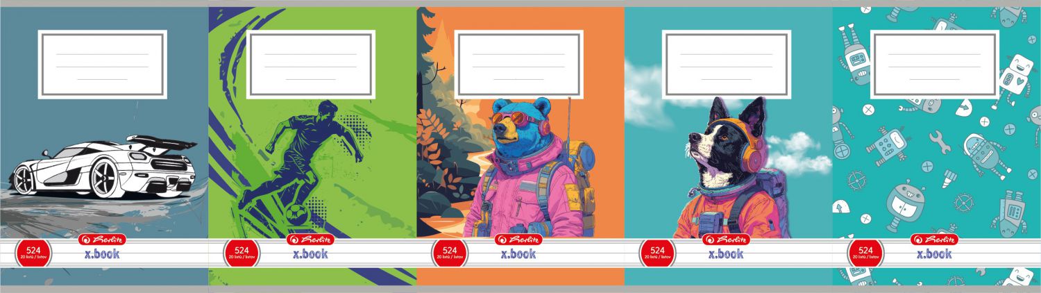 - Motivy auta, medvěda, pes, robotů nebo fotbalisty dodávají sešitu dynamiku a hravost.
