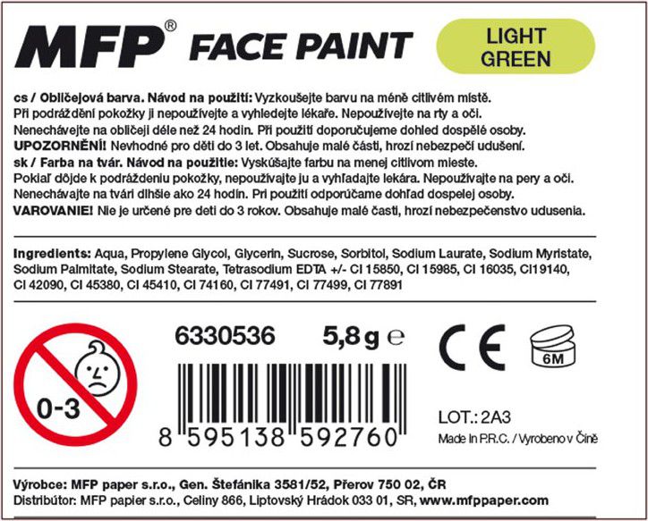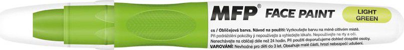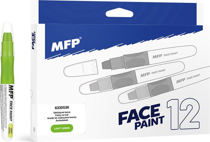 Barva na obličej světle zelená, na principu rtěnky (6 g). Díky těmto pestrým barvám vykouzlíte na tváři dítěte krásnou masku na karneval, párty nebo jinou oslavu. Dermatologicky testováno. Barva: světle zelená NÁVOD NA POUŽITÍ: 1. Doporučujeme vyzkoušet barvičky na méně citlivém místě. 2. Dojde-li k podráždění pokožky, nepoužívejte a vyhledejte lékaře. 3. Nepoužívejte na rty a oči. 4. Barvičkami malujeme na suchou pokožku. 5. Jednoduše omyvatelné vodou a mýdlem, barvy zdravotně nezávadné. 6. Nedoporučujeme nechávat na obličeji déle než 24 hodin. 7. Při použití doporučujeme dohled dospělé osoby. VAROVÁNÍ: Nevhodné pro děti do 3 let, nebezpečí spolknutí malých částí. Všech 12 ks je baleno v papírové krabičce. Uvedená cena je za 1 ks.