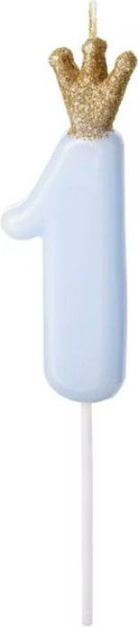 - Modrá dortová svíčka ve tvaru číslice se zlatou, glitrovou korunkou.