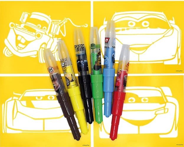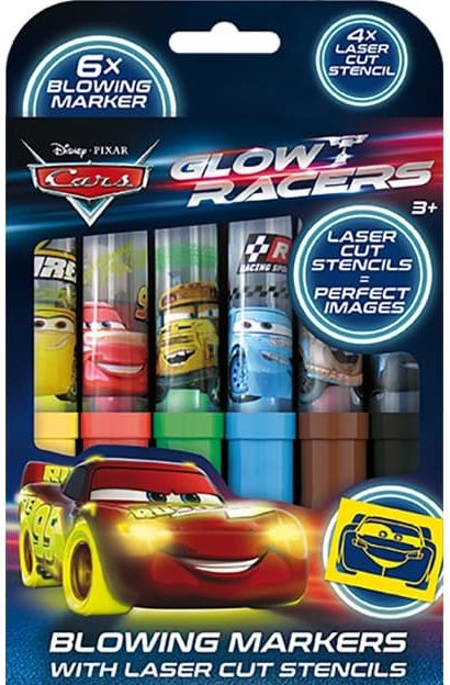 - Balení obsahuje 6 barevných foukacích fixů s potiskem a 4 barevné papírové šablonky v oblíbených pohádkových motivech.