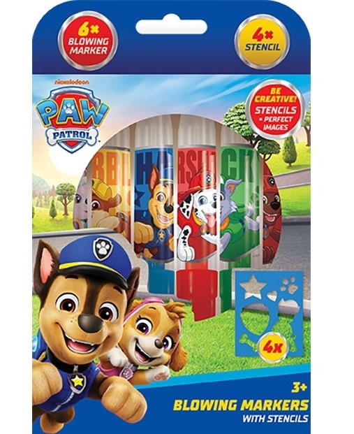 - Balení obsahuje: 6 barevných foukacích fixů s potiskem a 4 barevné papírové šablonky v oblíbených pohádkových motivech.