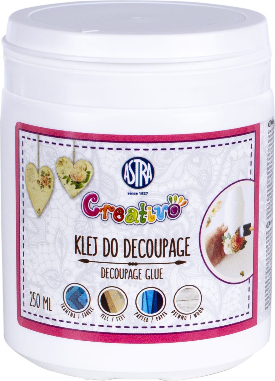 - Univezální lepidlo ASTRA na decoupage je viskózní lepidlo vhodné na všechny ubrouskové techniky a také na papír, dřevo, korek, keramiku, textil, alobal a polystyren.