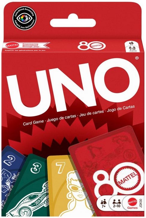 - Fanoušci skvělých hraček a her, které společnost Mattel během let vytvořila, si zamilují hru UNO k 80. výročí společnosti. Tento balíček obsahuje grafiku inspirovanou hračkami Mattel, přičemž hráči se snaží spojit barvy a čísla, stejně jako v klasické hře. A když vám zůstane poslední karta, nezapomeňte křičet UNO! Skvělý dárek pro fanoušky hraček a her Mattel i milovníky karetních her od 7 let. Barvy a vzhled karet se mohou lišit.