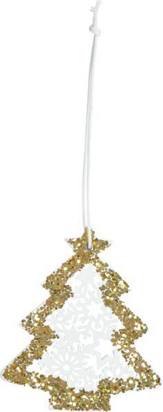 Vánoční dřevěné bílé ozdoby k zavěšení se stříbrnými a zlatými třpytkami.