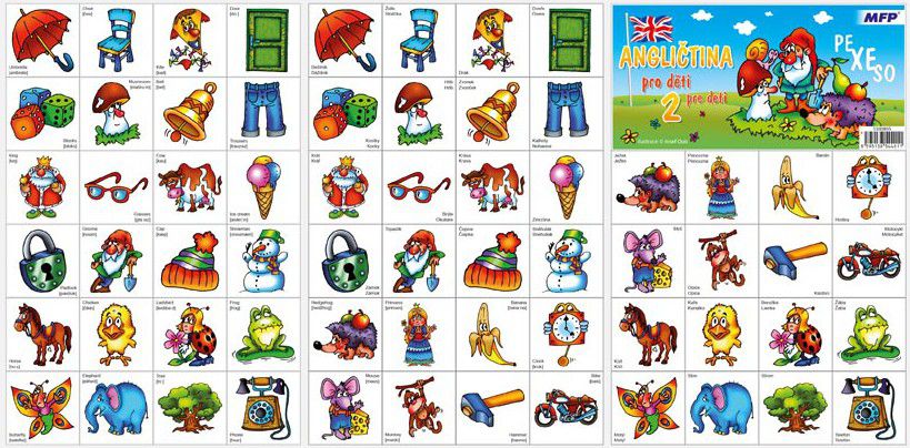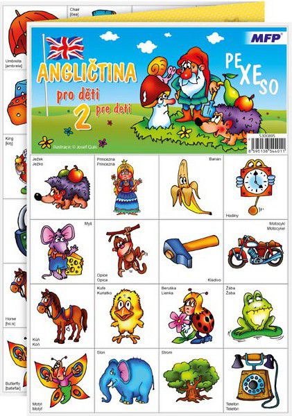 PEXESO je populární dětská stolní hra, která nikdy neomrzí a zapojit se můžou i dospělí. Pexeso - Angličtina pro děti 2 - je pokračováním po pexesu "Angličtina pro děti" a je vhodné pro děti, které se chtějí naučit anglicky. Věděli jste, že slovo PEXESO vzniklo souslovím slov PEKELNĚ SE SOUSTŘEĎ? Výborná učební pomůcka pro děti a rodiče. Naučte své děti poznávat nová slovíčka a procvičujte jejich paměť. Tato hra je zabaví na dlouhé hodiny. Pexeso se skládá ze tří A4, na kterých najdete 64 kartiček základních slovíček a návod ke hře - české i anglické názvy se správnou výslovností.