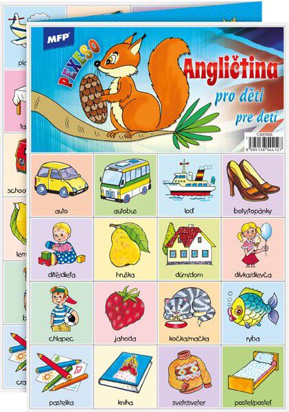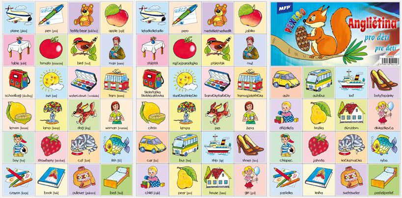 PEXESO je populární dětská stolní hra, která nikdy neomrzí a zapojit se můžou i dospělí. Pexeso - Angličtina pro děti - je vhodné pro děti, které se chtějí naučit anglicky. Věděli jste, že slovo PEXESO vzniklo souslovím slov PEKELNĚ SE SOUSTŘEĎ? Výborná učební pomůcka pro děti a rodiče. Naučte své děti poznávat nová slovíčka a procvičujte jejich paměť. Tato hra je zabaví na dlouhé hodiny. Pexeso se skládá ze tří A4, na kterých najdete 64 kartiček základních slovíček a návod ke hře - české i anglické názvy se správnou výslovností