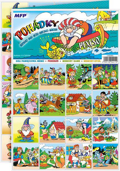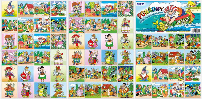PEXESO je populární dětská stolní hra, která nikdy neomrzí a zapojit se můžou i dospělí. Pexeso - Pohádky - nás zavede zpět k pohádkovým hrdinům z českých pohádek Hrnečku vař!, O šípkové Růžence, Kocour v botách, Čert a Káča a mnoho dalších. Věděli jste, že slovo PEXESO vzniklo souslovím slov PEKELNĚ SE SOUSTŘEĎ? Výborná učební pomůcka pro děti a rodiče. Naučte své děti poznávat zvířata a procvičujte jejich paměť. Tato hra je zabaví na dlouhé hodiny. Pexeso se skládá ze tří A4, na kterých najdete 64 kartiček z českých pohádek a návod ke hře. NÁVOD KE HŘE PEXESO: Pexeso mohou hrát nejméně dva hráči. Všechny rozstříhané kartičky zamíchají a rozloží obrázkem dolů do čtverce 8 x 8 kartiček. Nesmí se při tom dívat na obrázek. Hráči si určí pořadí hry. Hráč otočí dvě libovolné kartičky tak, aby si i ostatní spoluhráči mohli obrázky a jejich umístění zapamatovat. Pokud nemají kartičky stejné obrázky, otočí je a vrátí na původní místo. Pokračuje další hráč, který je na řadě. Jestliže objeví stejné obrázky, získává bod a obě kartičky vyřadí ze hry. Pokračuje do té chvíle, kdy otočí dva různé obrázky. Vyhrává hráč, který získá více bodů. PAPÍR: křída matná 350g + lamino lesk 1/1 VELIKOST HRACÍCH KARET: 51x51cm VAROVÁNÍ: Nevhodné pro děti do 3 let. Nebezpečí vdechnutí a spolknutí malých částic. Uvedená cena je za 1 ks.