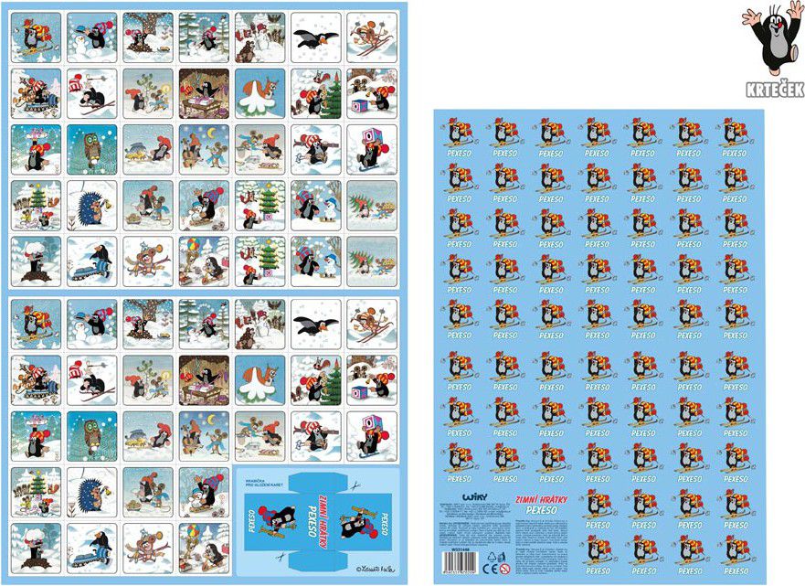 Vystřihovací pexeso Krtek - Zimní hrátky. Jedná se o pexeso s motivy Krtka a jeho přátel, které je zaměřené na zimní tématiku. Pexeso je tradiční stolní hra, která slouží k procvičování paměti a soustředění. Hra rozvíjí schopnost zapamatovat si, kde se jednotlivé obrázky nacházejí, a podporuje tak kognitivní dovednosti, především paměť a koncentraci. Pexeso je oblíbené mezi dětmi, ale také dospělými, protože je zábavné a jednoduché na pochopení.